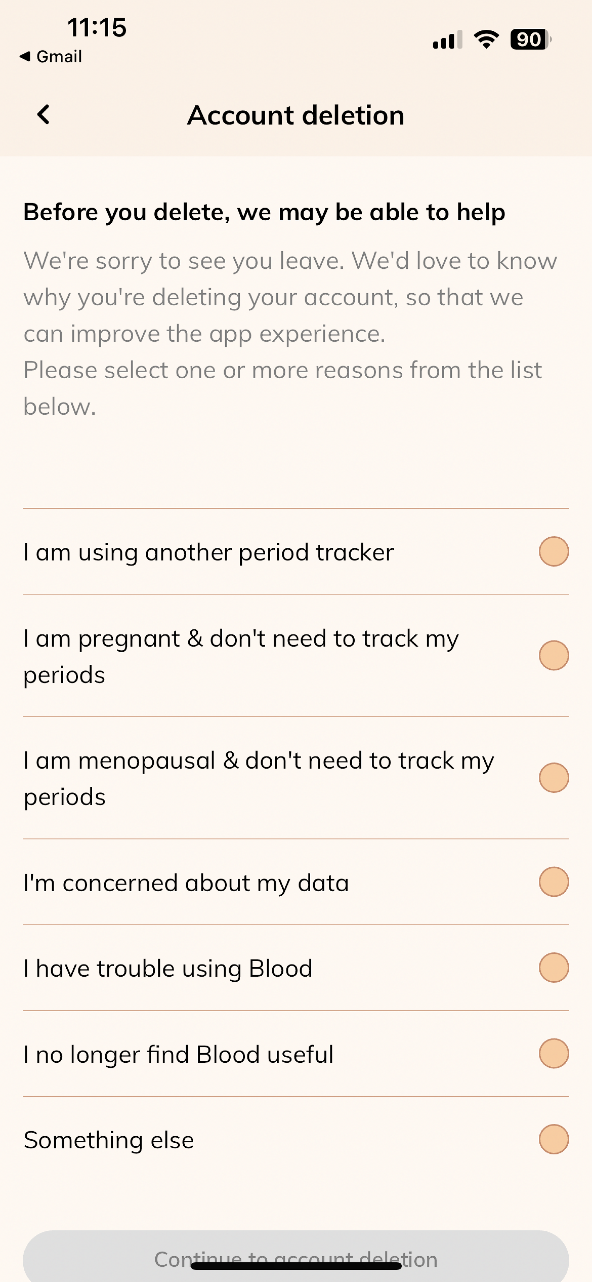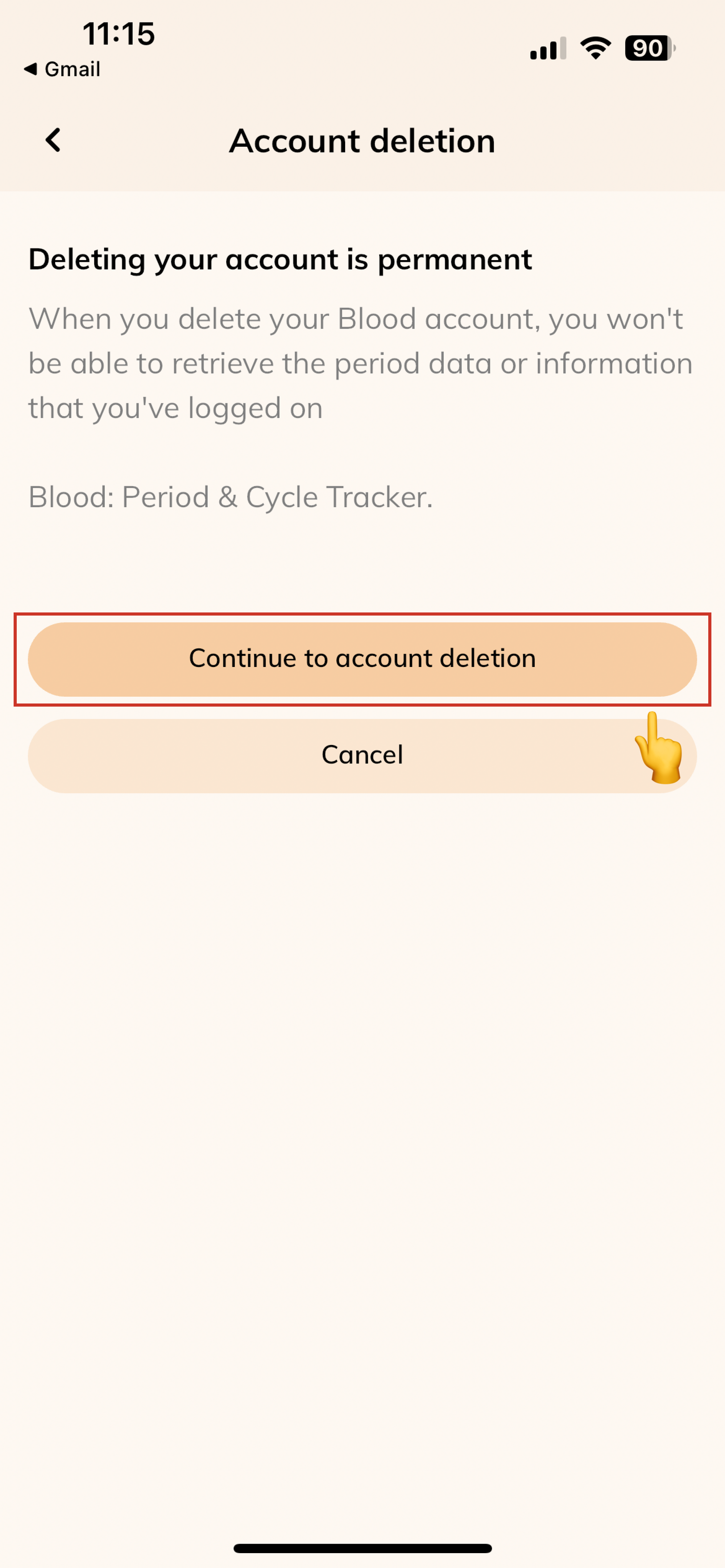 Before proceeding please be reminded that once you delete your account, we will not be able to retrieve your historical period data, symptoms you’ve logged and Care messages you’ve received from your partner. Kindly take a moment to review the implications this action can have before proceeding further. Once you are ready, follow the steps below to delete your account: